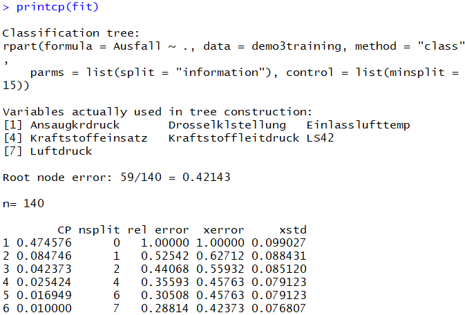 # 4 Modell verwenden ----# Vorhersage# CSV-Datei einlesen und speicherndemo3test=read.csv2("automotive_data_test_4.csv",header = TRUE,sep = ";",dec = ".")# Erstelle Testdaten# ohne Massungsnr.testdata=demo3test[ ,c(-1)]# Vorhersagepred = predict(fit,newdata=testdata, type="class")# Füge die vorhergesagten Werte# in die Spalte Ausfall eindemo3test$Ausfall = as.vector(pred)demo3test