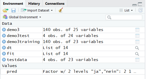 Wie in der obigen Ausgabe (gefüllte Spalte Ausfall im Testdatensatz) zu erkennen ist, führen die zweite und vierte Merkmalskombination laut Baum zu einem Ausfall (Wert/Level: "ja"), die anderen Beiden laut Modell aber nicht (Wert/Level: "nein").